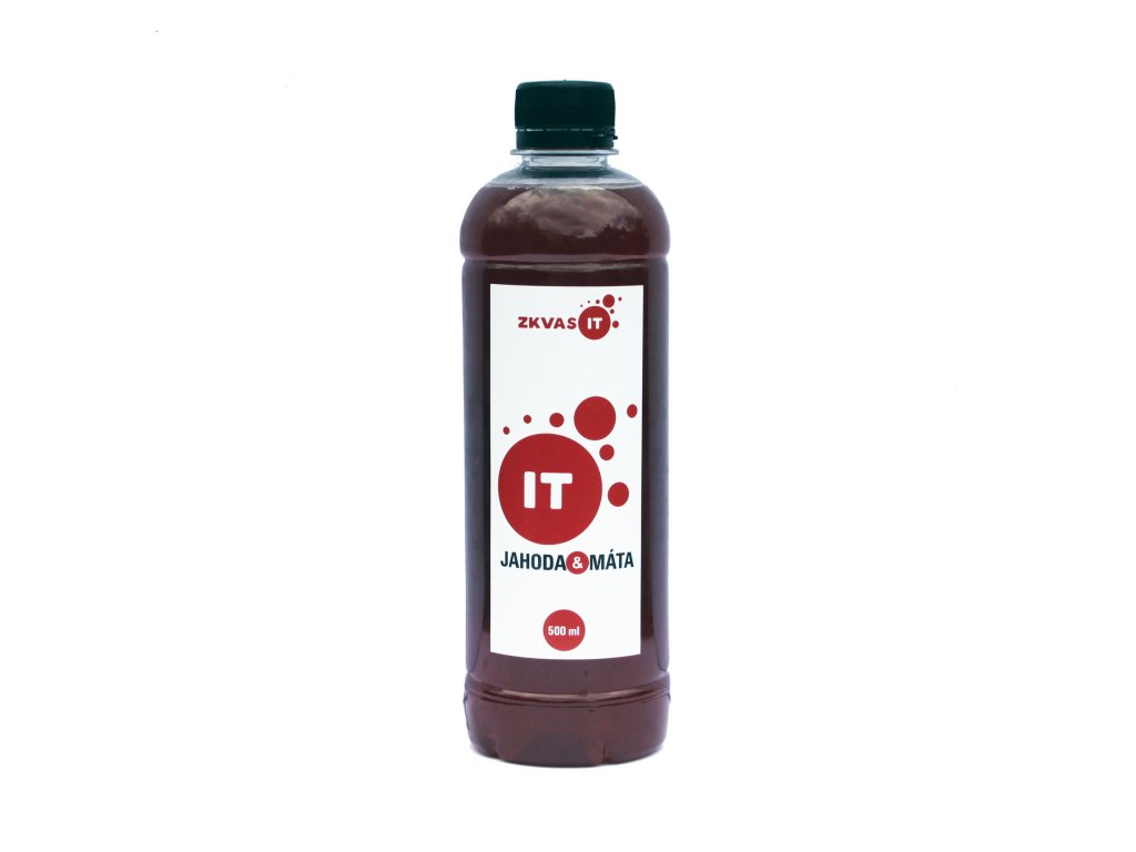Složení: voda, cukr, černý čaj, fermentační kultura kombuchy (SCOBY), jahody (5%), máta (1%)