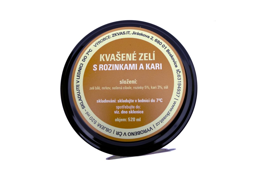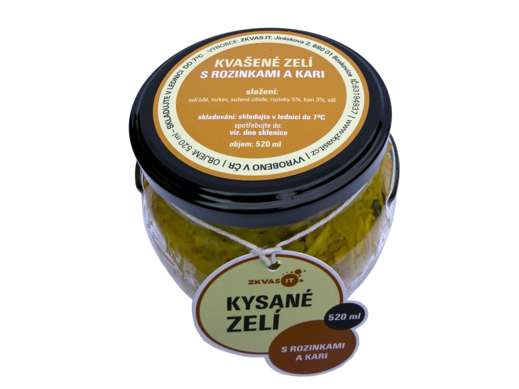 zelí bílé, mrkev, sušená cibule, rozinky 5%, kari 3%, sůl