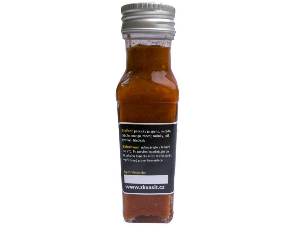 Složení: papričky jalapeňo, rajčata, cibule, mango, zázvor, rozinky, sůl, tymián, hřebíček